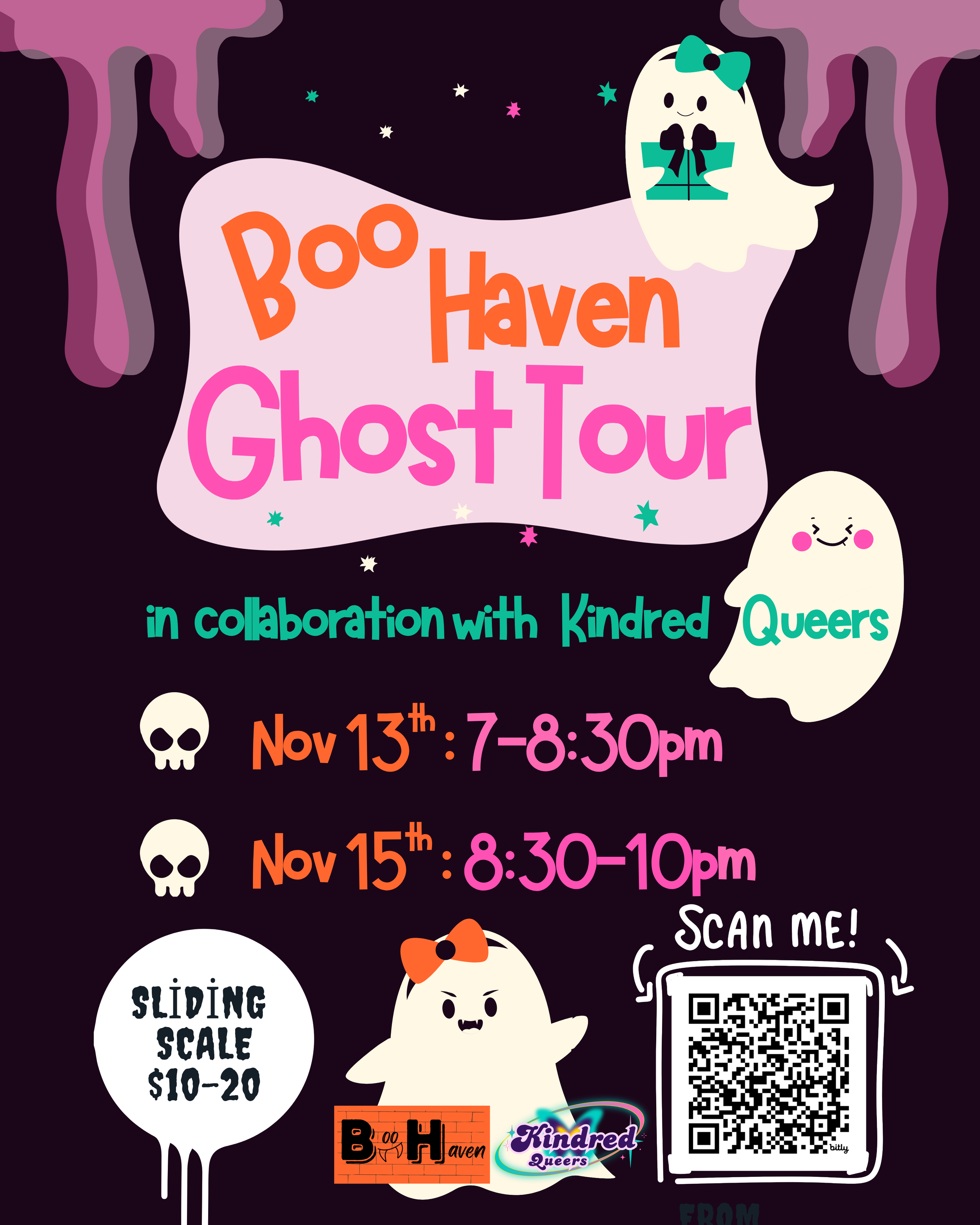 Boo Haven is a newly launched paranormal city walking tour for queerdos & revolutionaries. We are excited to launch our ghost tours in collaboration with Kindred Queers, a queer and BIPOC-led initiative that hosts sober events for queer folx 27 and up.